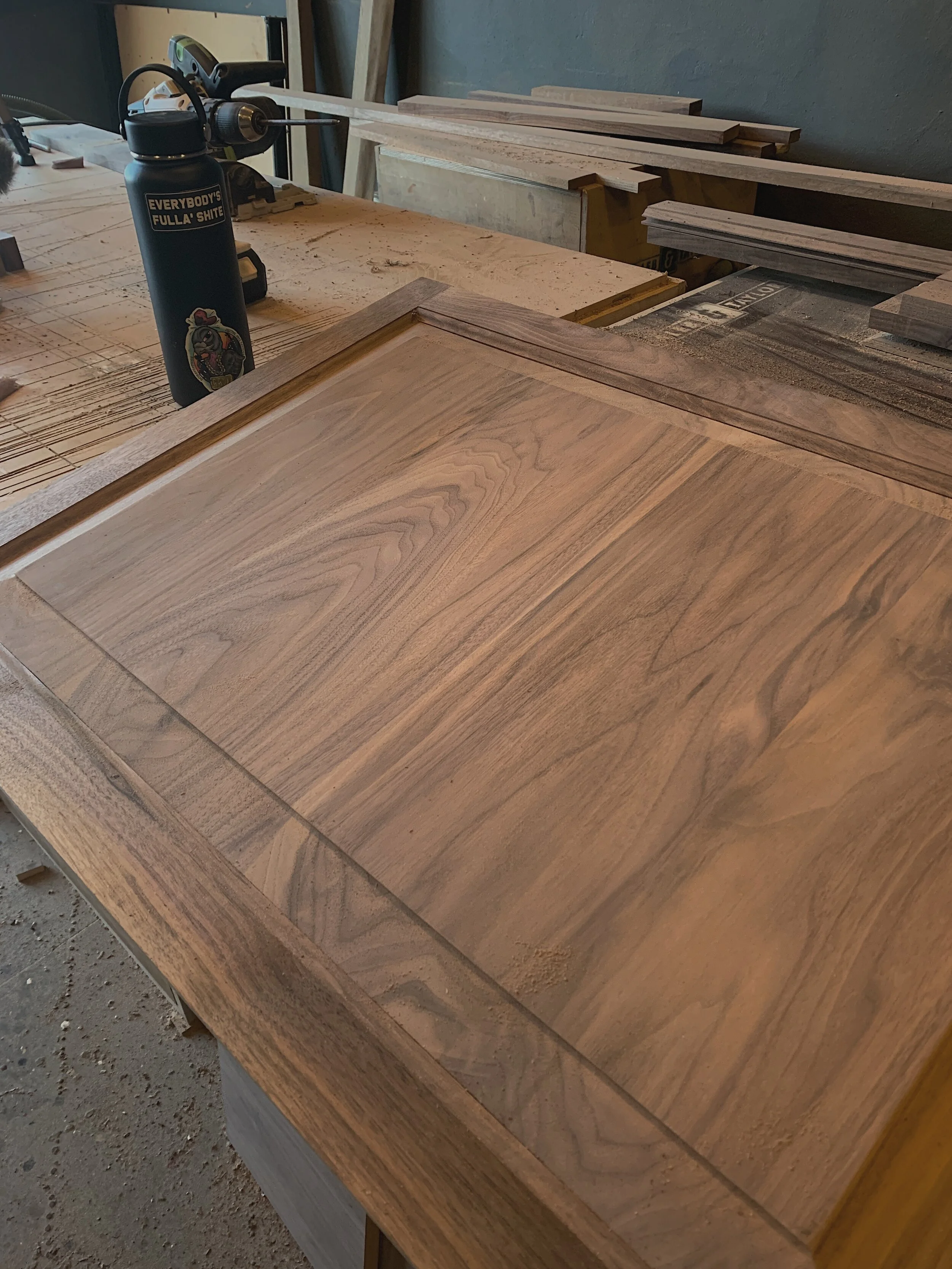 I’m still working on this set of walnut media cabinets. Turning out nice and this is one of the doors that will have the leather on the back for pouring your whisky.