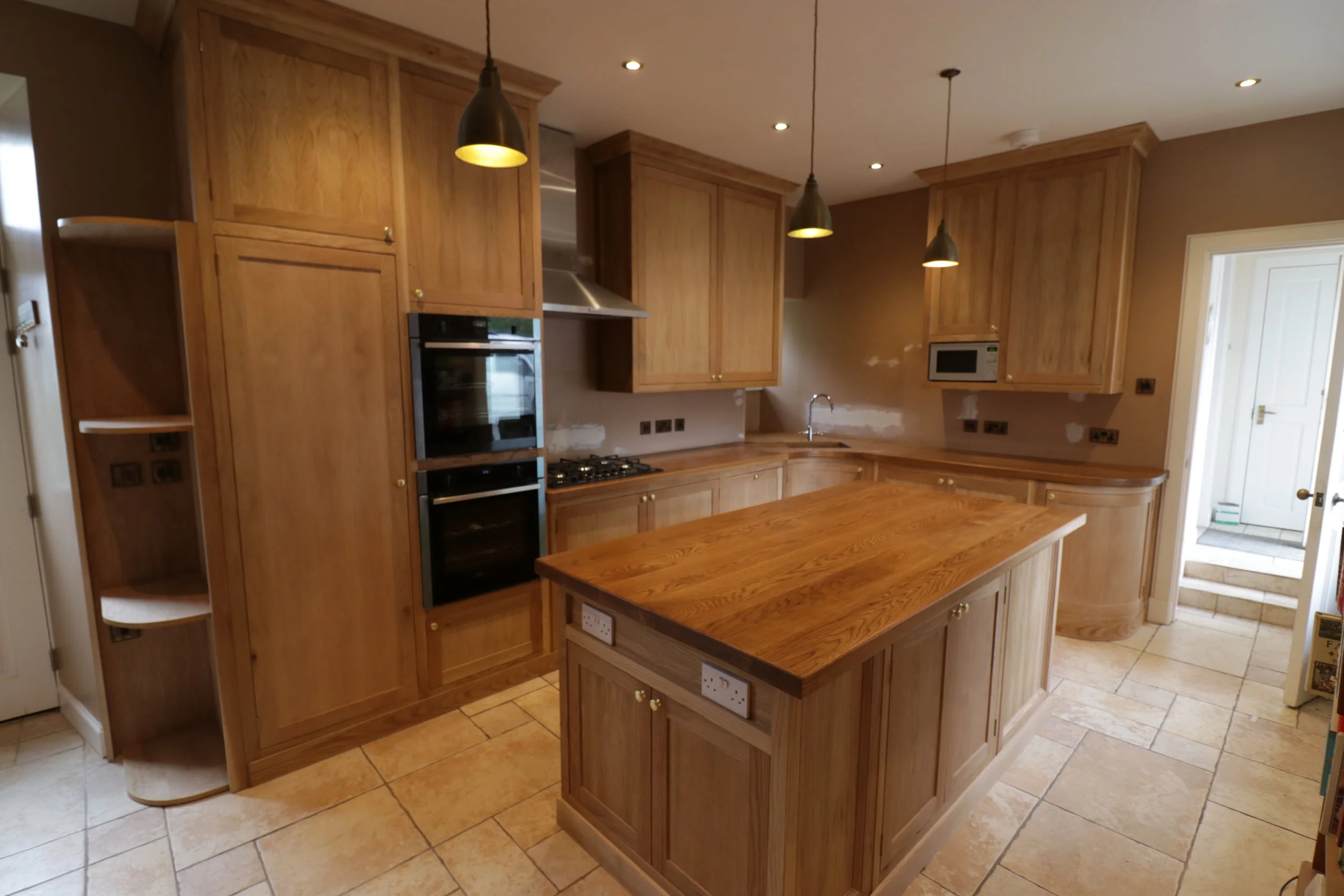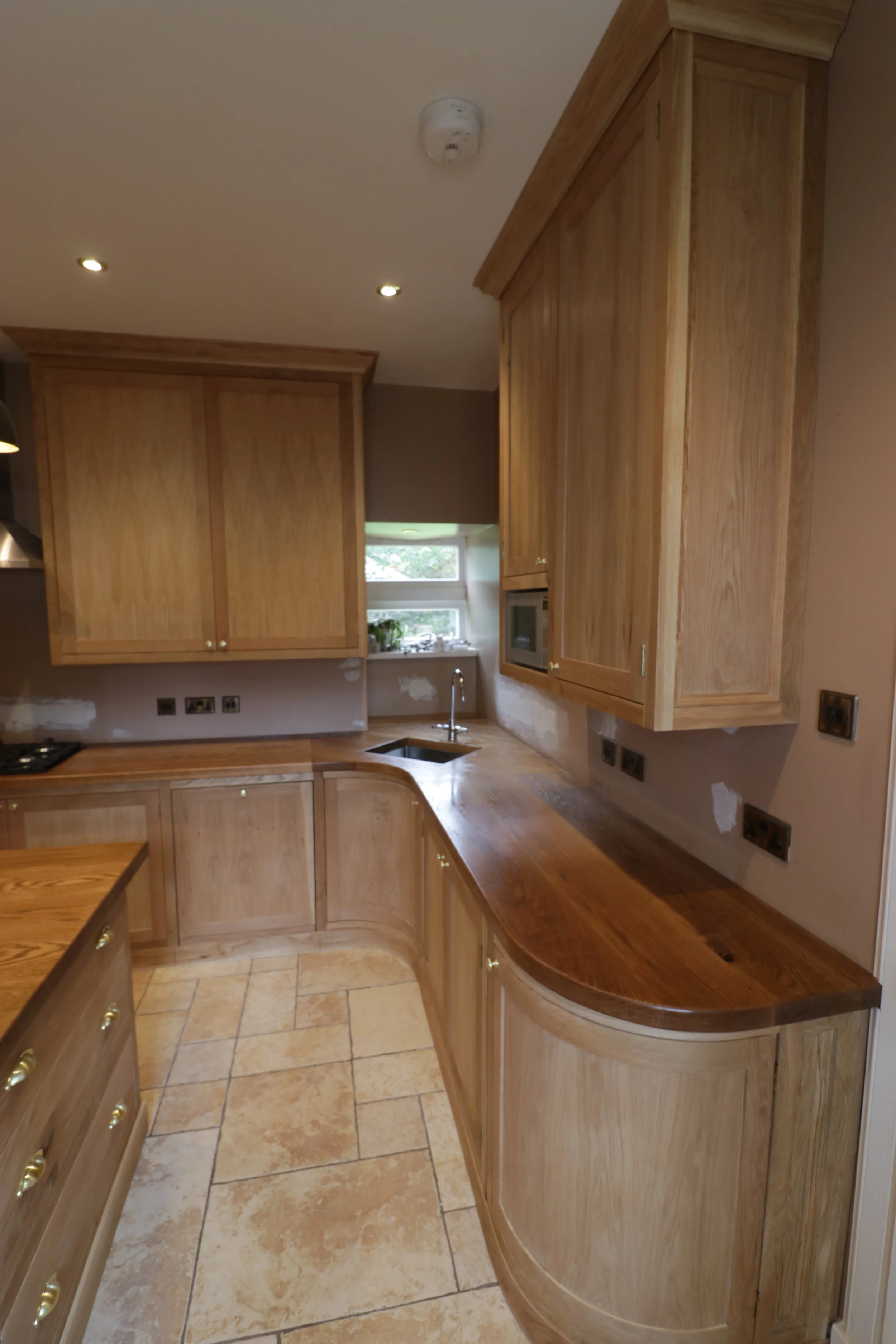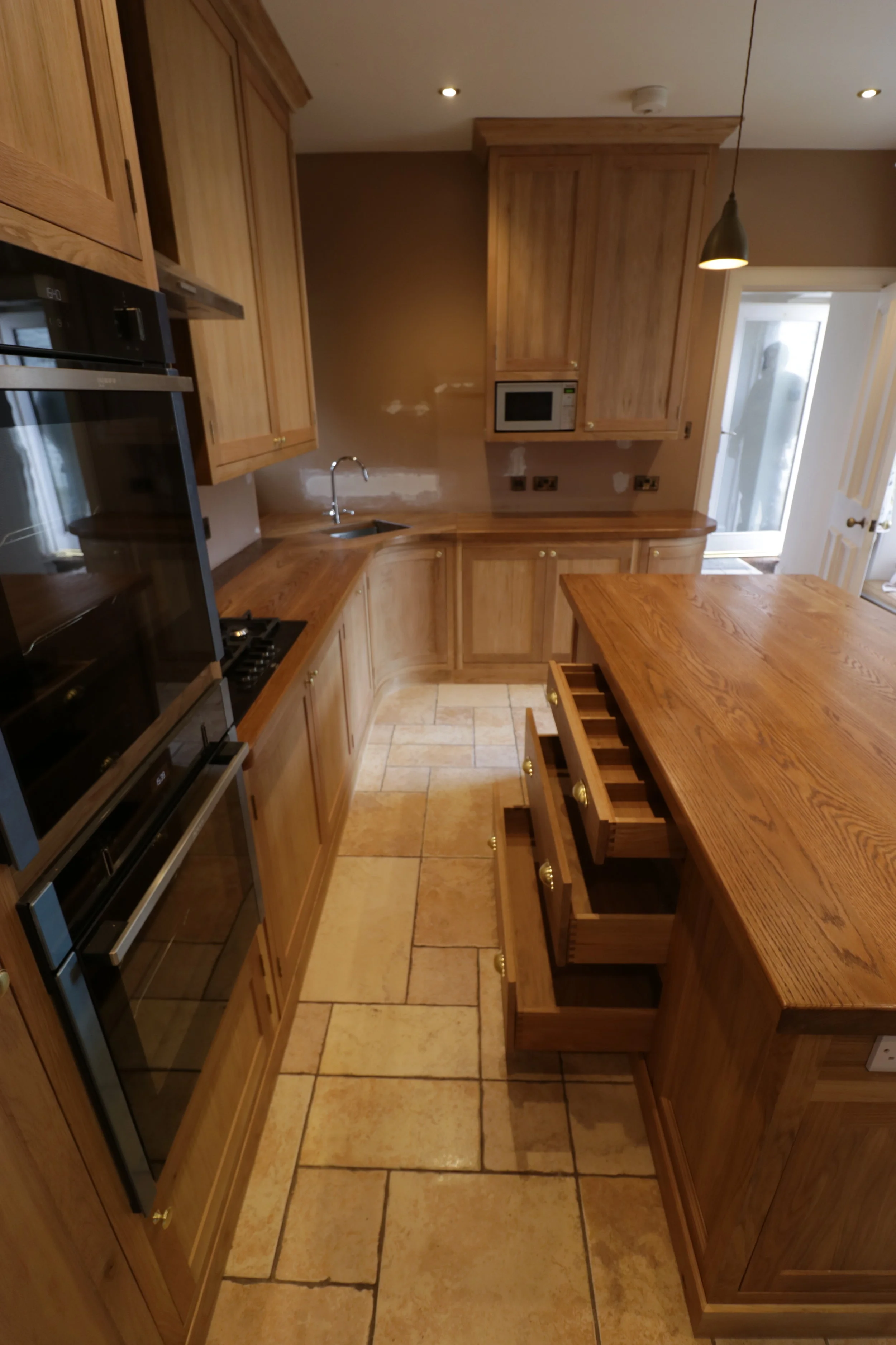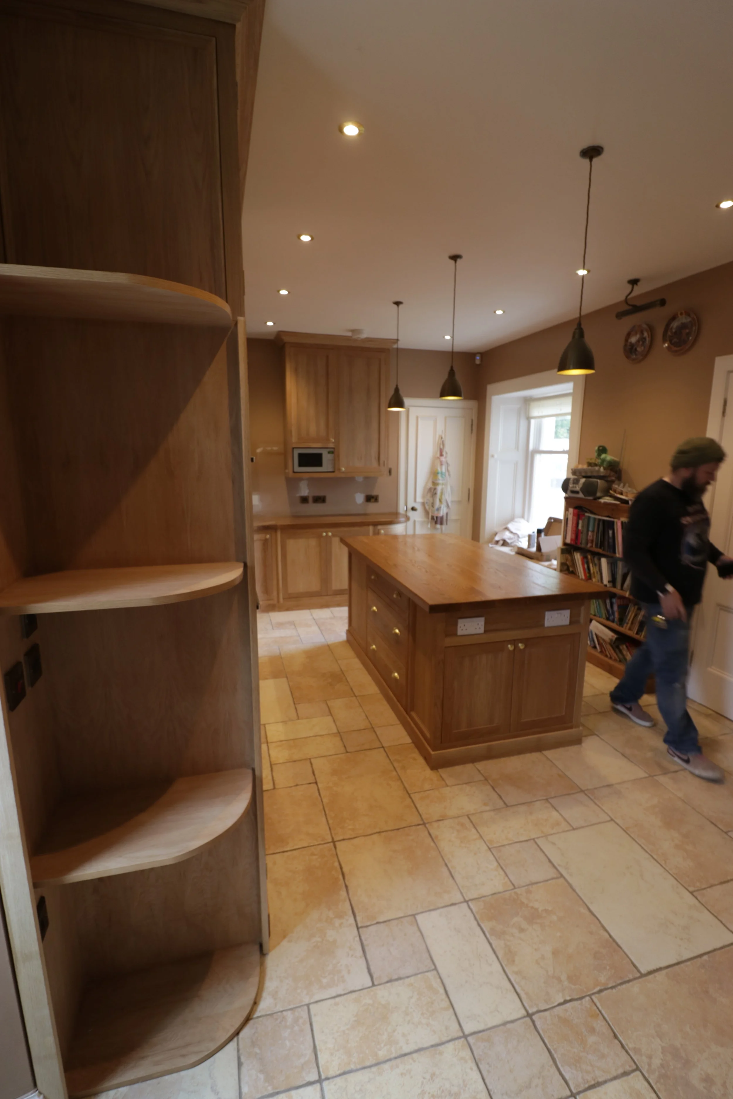 Solid oak face frame cabinets with an inset door on a butt hinge. All hand made here in the workshop in Argyll. Solid oak worktops, also all handmade in Argyll. Both the cabinets and worktops were finished with an oil. A clear for the cabinets and a darker shade for the worktops. This was fitted in a house in Argyll but we’ve done work all over so even if you’re looking for a bespoke kitchen in even Glasgow or Edinburgh then we’re happy to deliver and fit wherever you live.