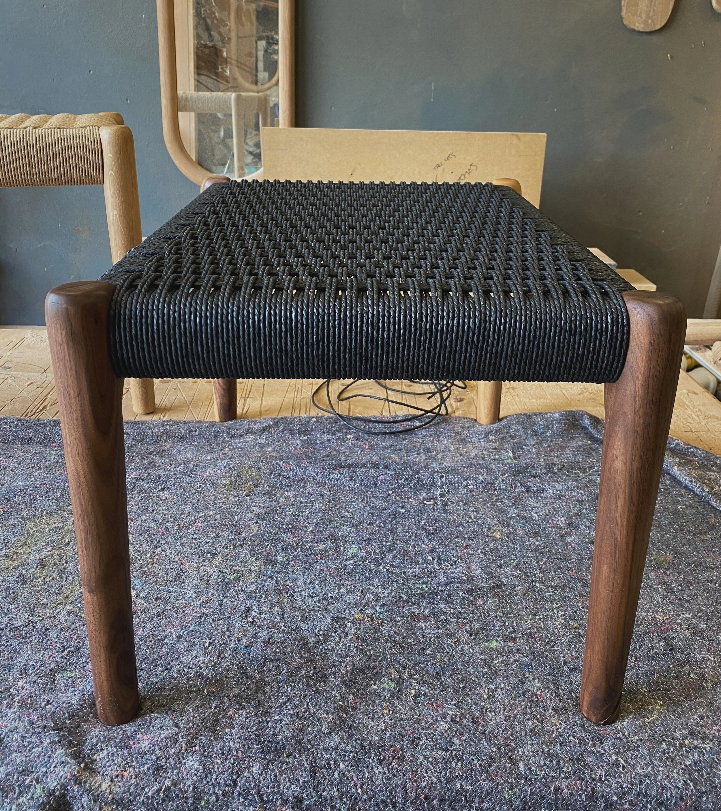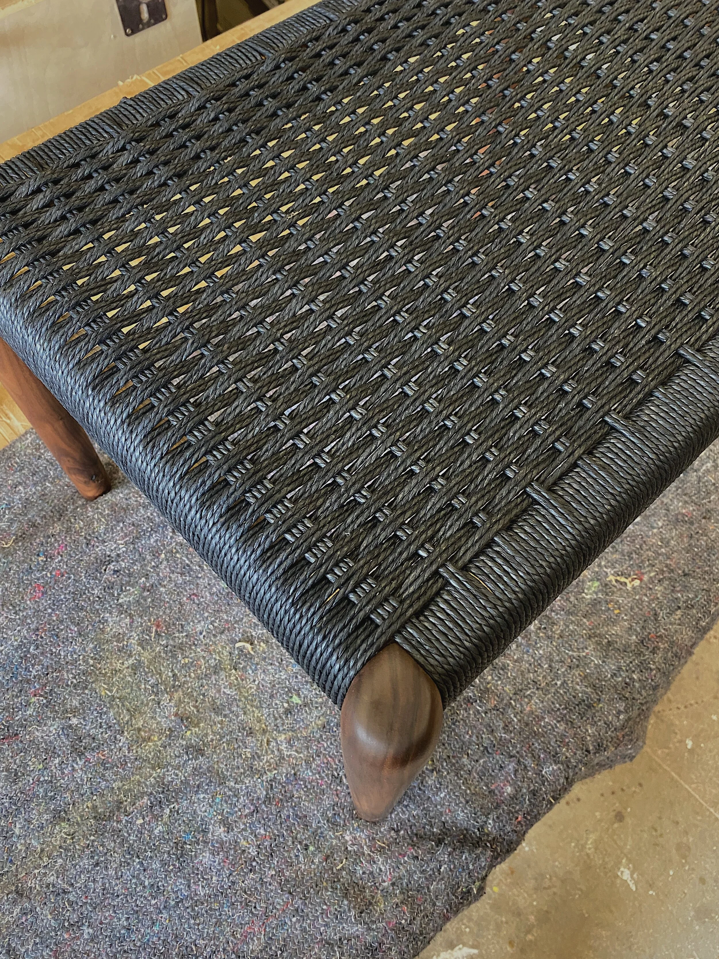 /Just finished a small stool, legs are in walnut and I used the black danish cord.