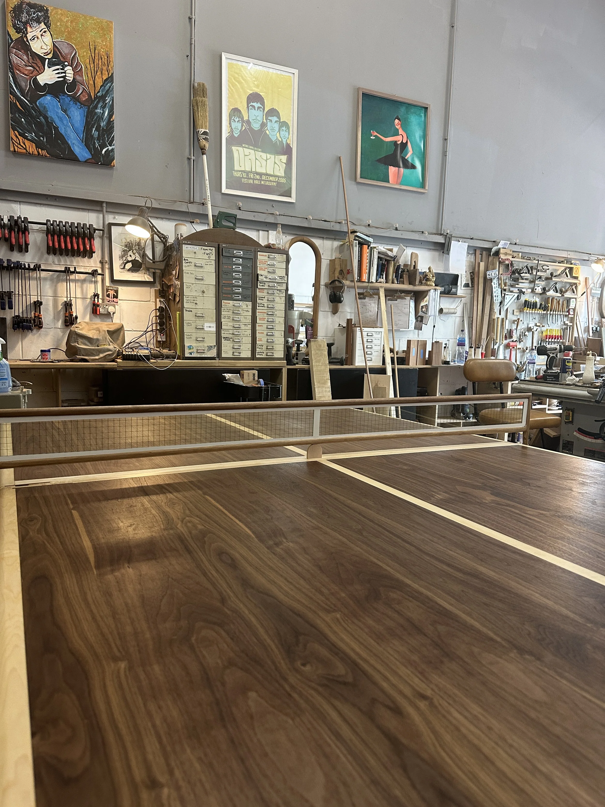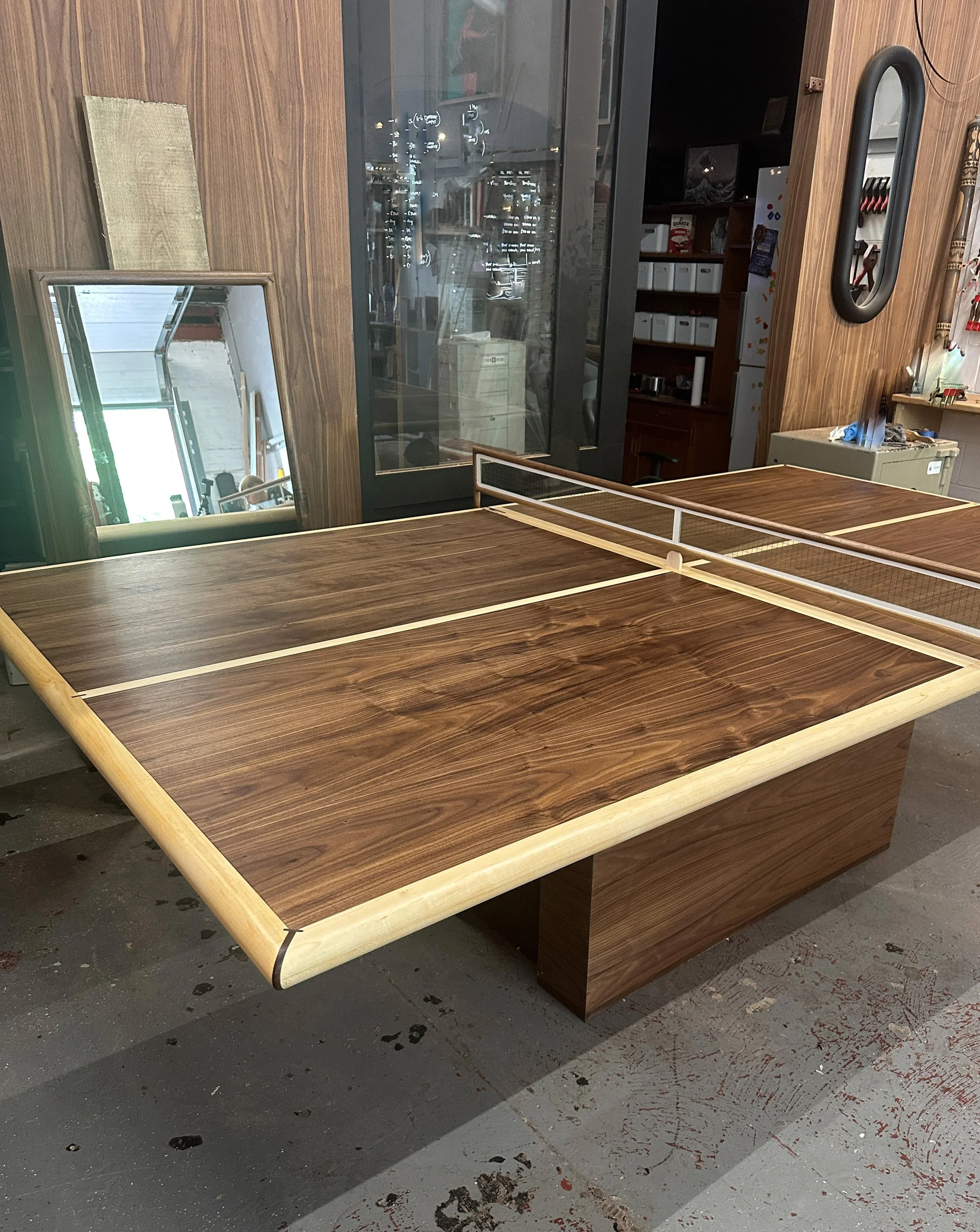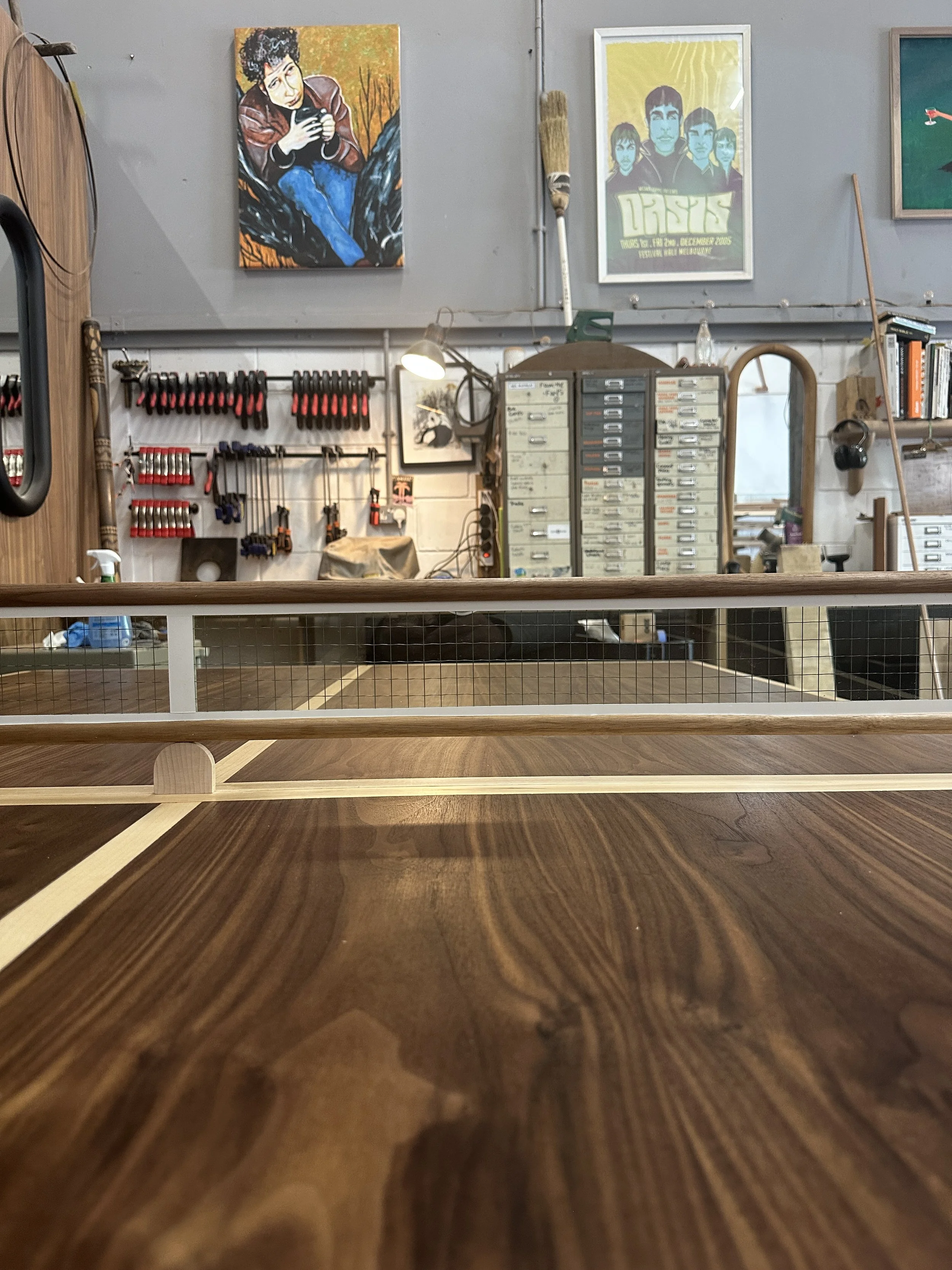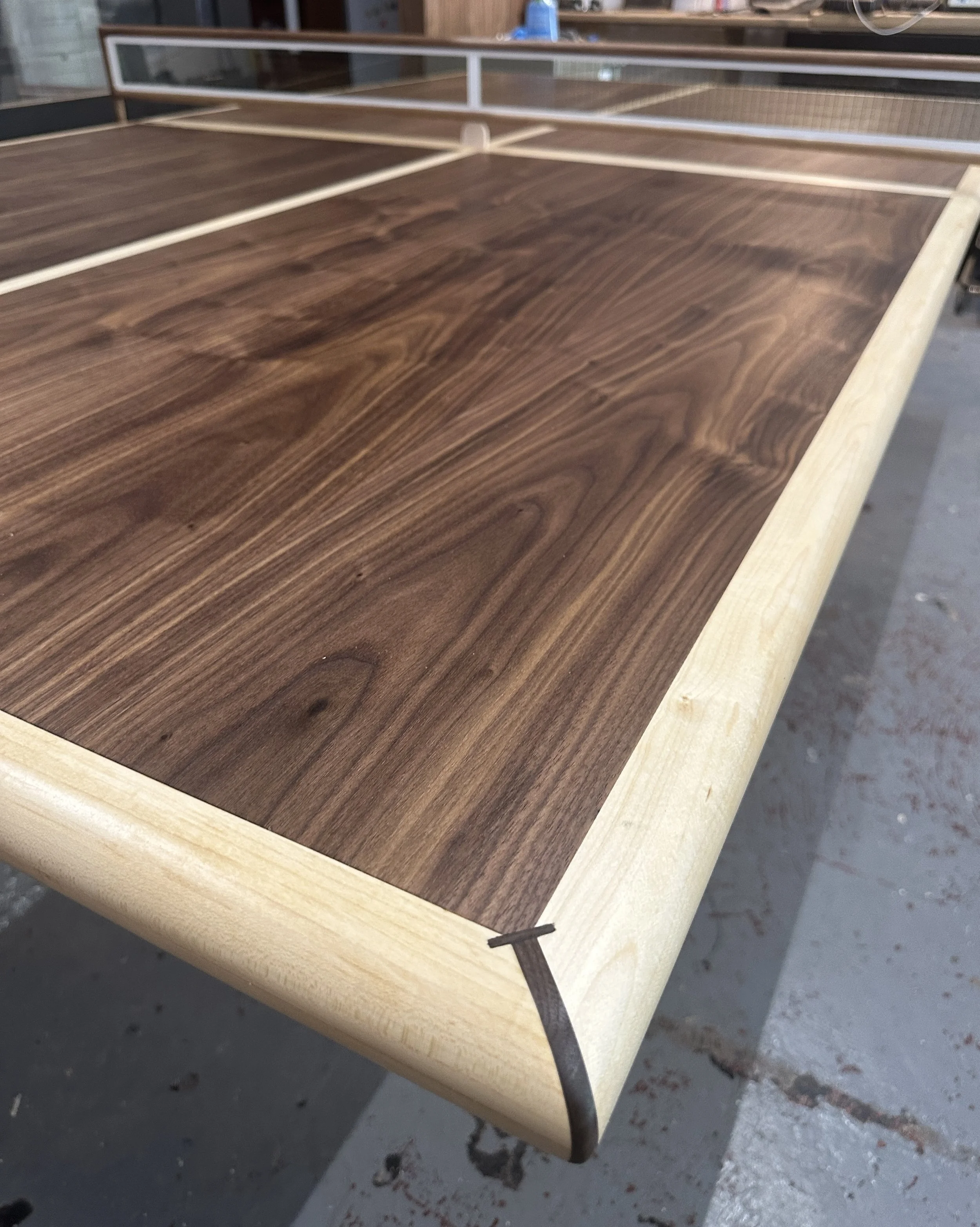 It’s made with solid 4mm walnut on birch plywood with solid maple. There’s a metal frame under it to deal with how far over the base the table hangs. Engineering, man :)