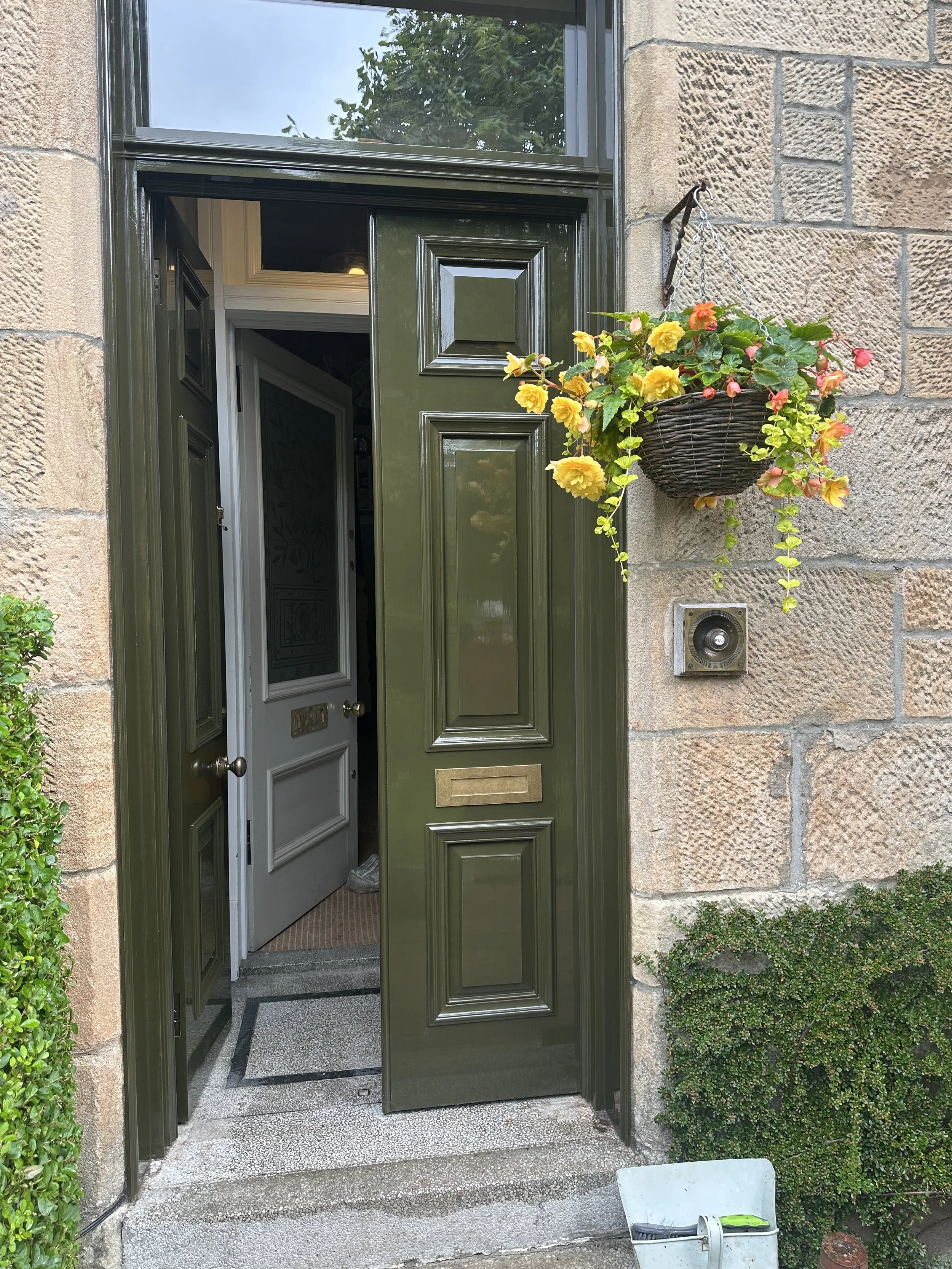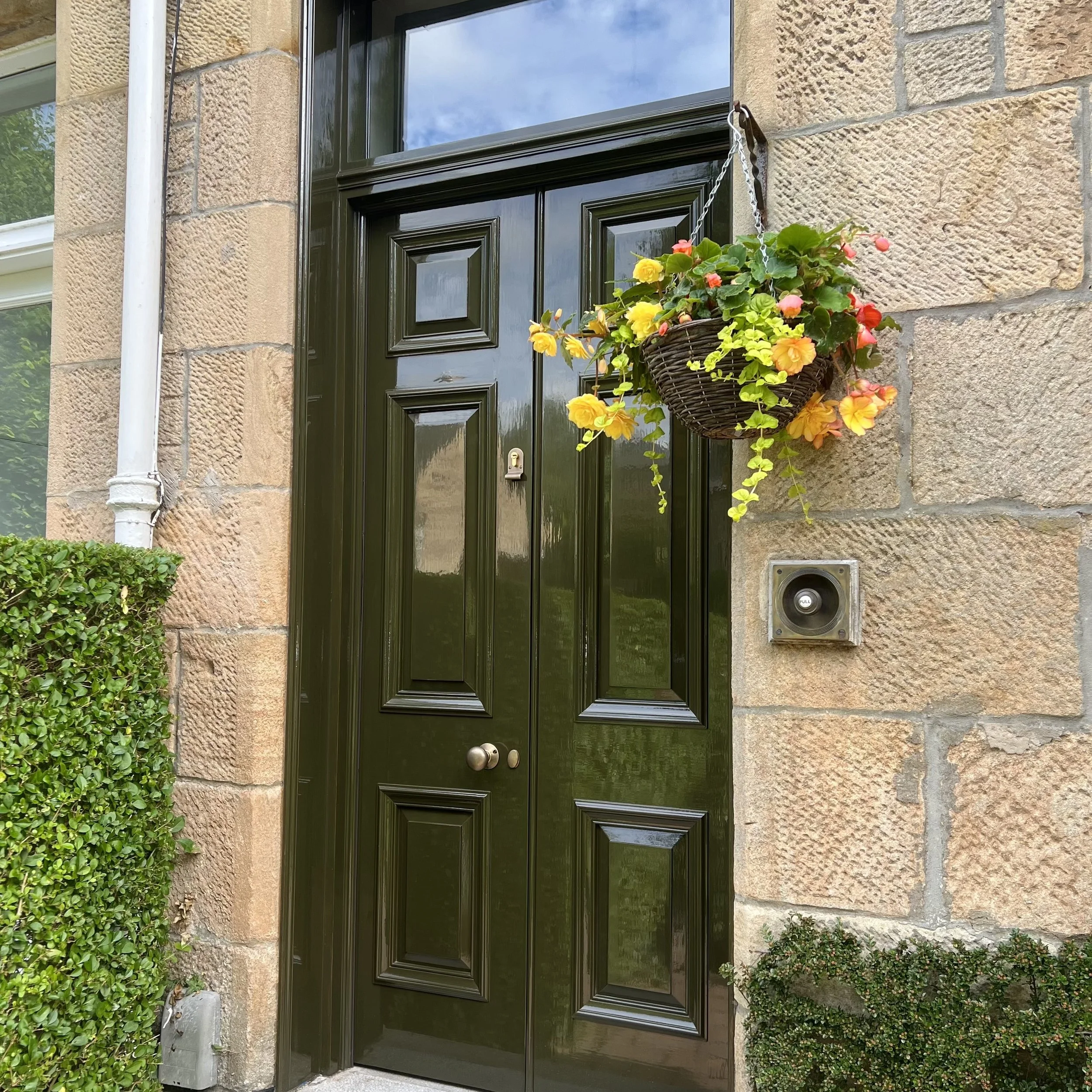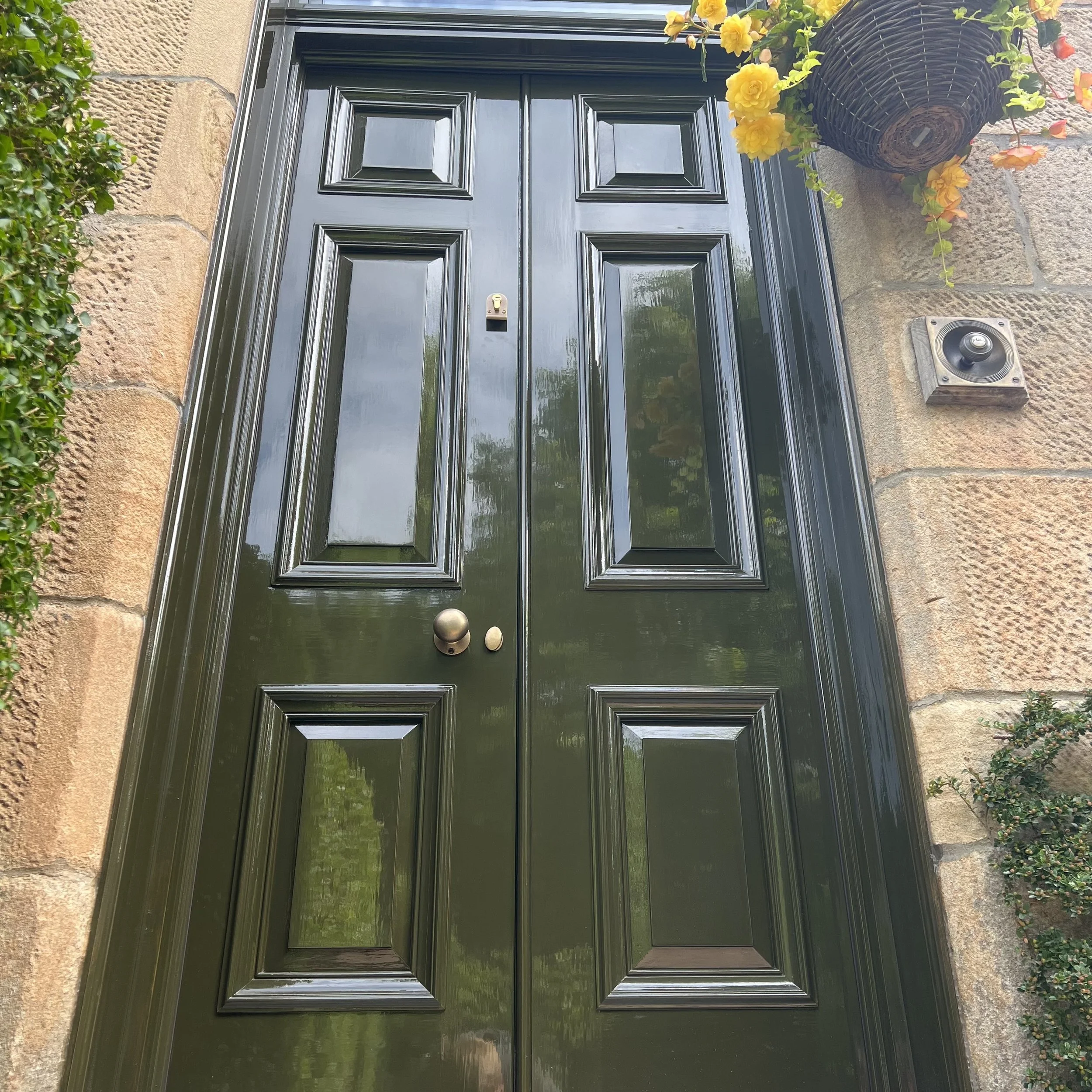 There’s a letterbox on these doors now, I forgot to put one in, mixed up between a few different doors but got it fitted at the house. Antique brass ironmongery. Raised panels. Super glossy paint, clear glass in the fanlight.