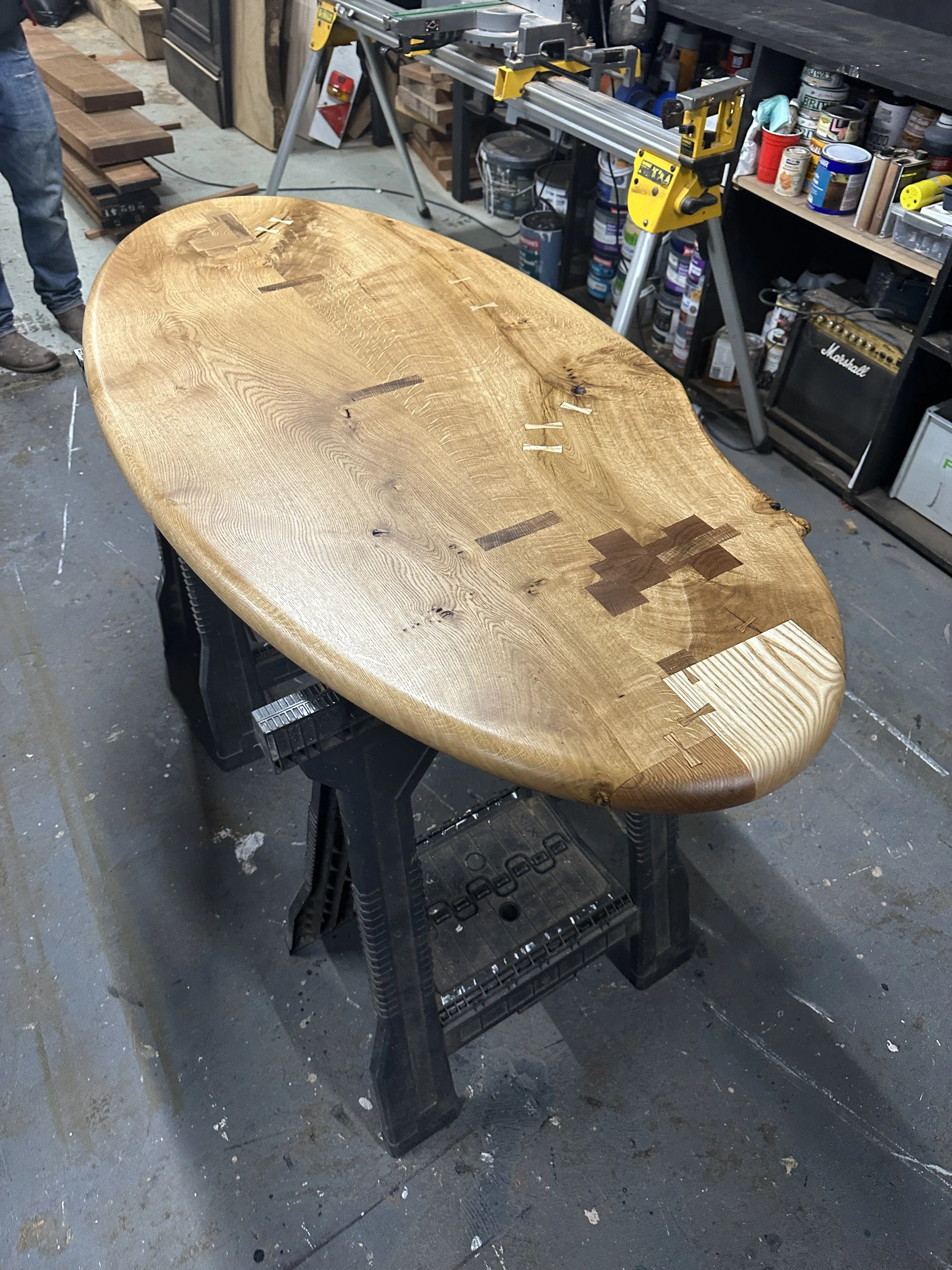 Here’s an oak table, it’s got patches all over it, all the wood is stuff I’ve been finding/keeping for the past however many years. There’s some stuff from Lochgoilhead, a few pieces from Ayrshire. We’ll do the base for it then it’ll be ready to be traded for some dough. We’re going to have a couple of weekends through the summer to test out how our hospitality goes. We’ll have a lot of our work there and ready to go, might be good, we’ll let you know when it is.
