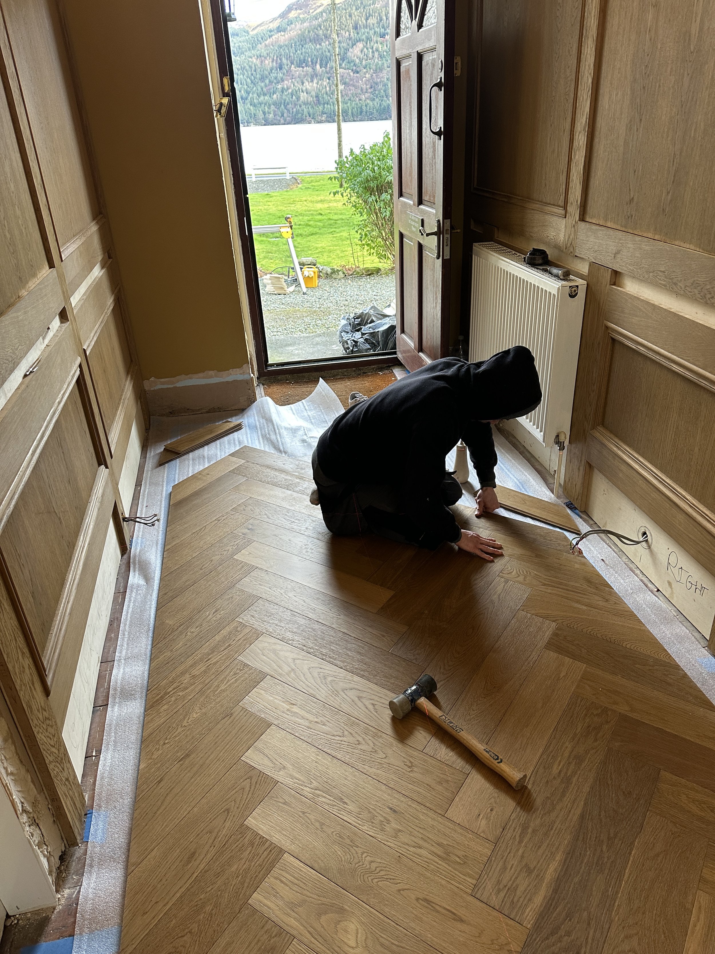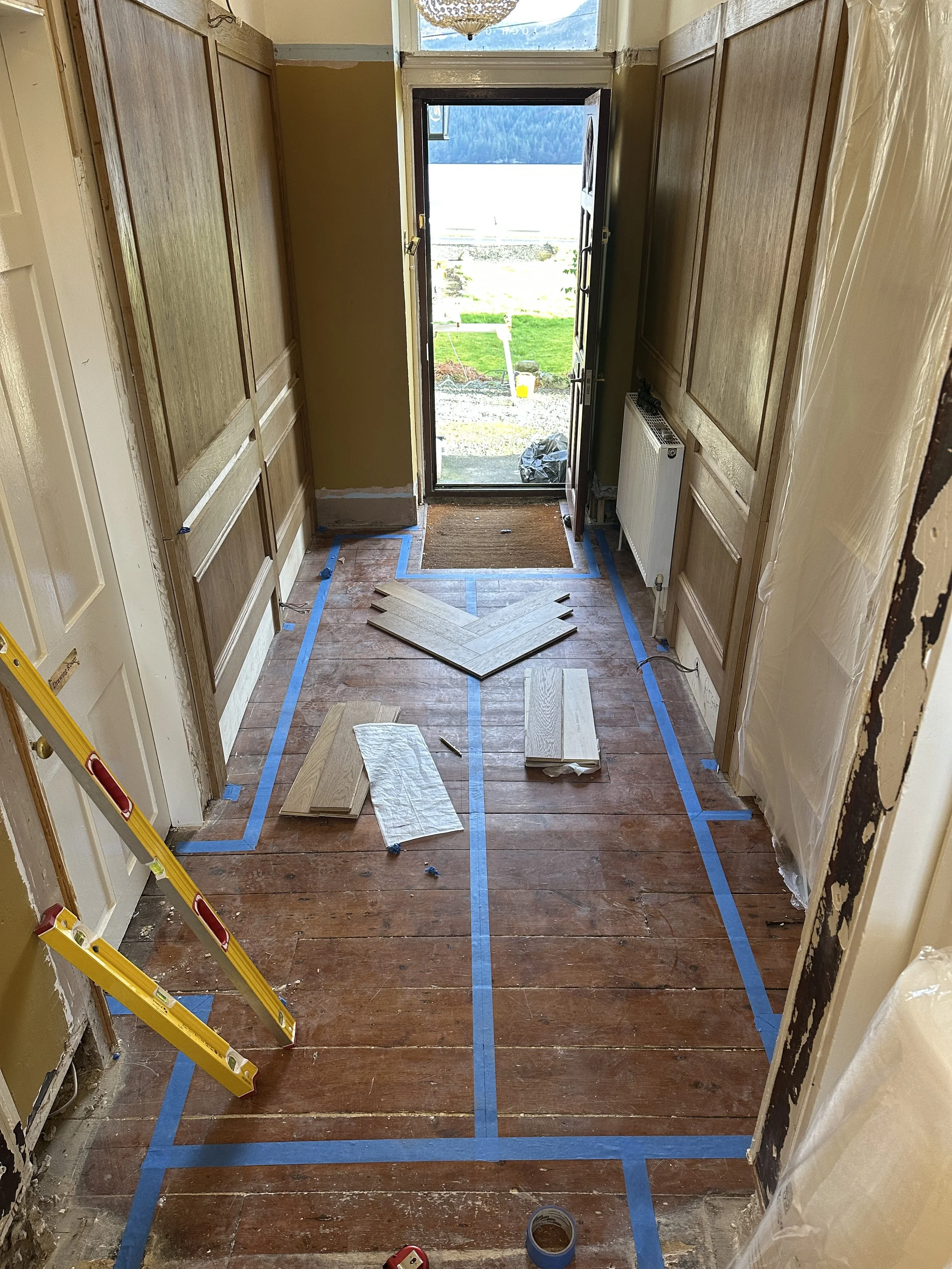 Above is a hallway we’re doing panelling and some herringbone flooring to. More pictures & videos to come over the next month. Oak with a stain called “Antique Bronze” from Rubio Monocoat.